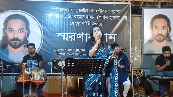 বাঁশের খুঁটি ও ছনের তৈরি দোচালা ঘর আর খোলা প্রান্তরে শত শত মানুষ—সবাই এসেছেন অকালপ্রয়াত সংগীতশিল্পী মতিউর রহমান হাসান ওরফে পাগল হাসানকে স্মরণ করতে।