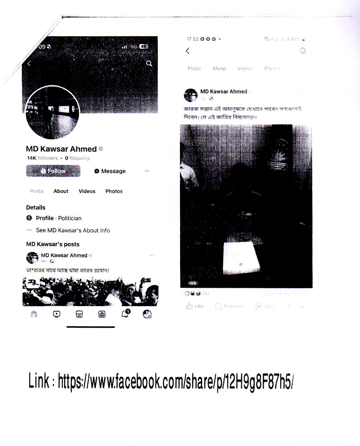 তারা মামলার বাদীকে নিয়ে ফেইসবুকে বিদ্বেষমূলক অপপ্রচার চালিয়ে আসছে। এজাহারের সাথে তাদের ফেইসবুক আইডির পোষ্টের স্ক্রিনশটের কপি সংযুক্ত করা হয়েছে।