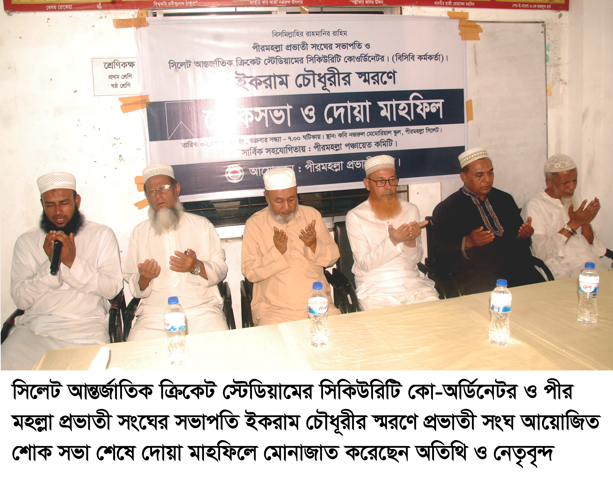 বাংলাদেশ ক্রিকেট বোর্ডের কর্মকর্তা, সিলেট আন্তর্জাতিক ক্রিকেট স্টেডিয়ামের সিকিউরিটি কো-অর্ডিনেটর ও পীর মহল্লা প্রভাতী সংঘের সভাপতি ইকরাম চৌধূরীর স্মরণে শোক সভা ও দোয়া মাহফিল অনুষ্ঠিত হয়েছে।