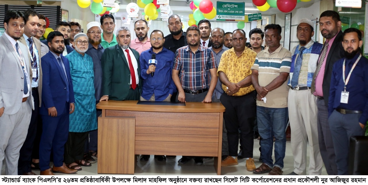 শরীয়াহ ভিত্তিক ইসলামী স্ট্যান্ডার্ড ব্যাংক পিএলসি-এর ২৬তম প্রতিষ্ঠাবার্ষিকী উপলক্ষ্যে সিলেট শাখার উদ্যোগে মঙ্গলবার (৩ জুন) এক মিলাদ মাহফিল অনুষ্ঠিত হয়েছে। মিলাদ মাহফিলে দোয়া পরিচালনা করেন মওলানা নাইম আহমেদ।