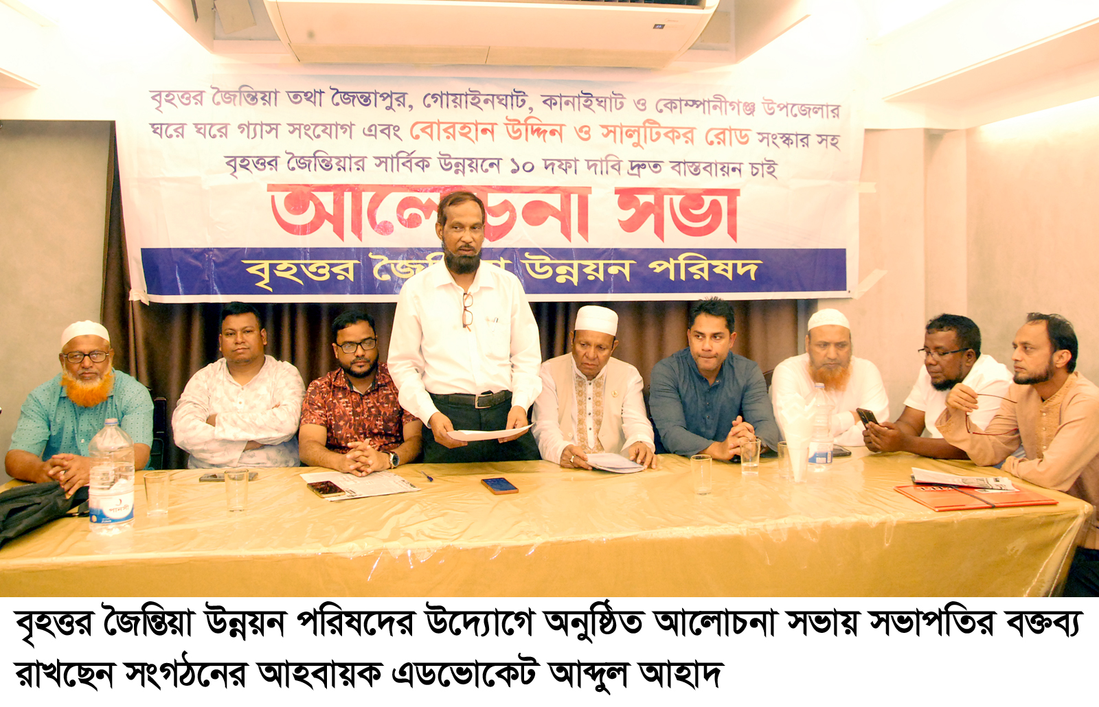 বৃহত্তর জৈন্তিয়া উন্নয়ন পরিষদের আহবায়ক এডভোকেট আব্দুল আহাদের সভাপতিত্বে ও সদস্য সচিব গোলজার আহমদ হেলালের পরিচালনায় সভায় বক্তব্য রাখেন যুগ্ম আহবায়ক এবং সিলেট প্রেসক্লাবের সাবেক সিনিয়র সহ-সভাপতি, কানাইঘাট প্রেসক্লাবের প্রতিষ্ঠাতা সভাপতি ও দৈনিক সিলেট বাণী’র নির্বাহী সম্পাদক এম এ হান্নান, যুগ্ম আহ্বায়ক মাওলানা হোসাইন আহমদ, যুগ্ম আহবায়ক ফয়েজ আহমদ, যুগ্ম আহবায়ক আসাদুল আলম চৌধুরী, যুগ্ম সচিব এডভোকেট কবির আহমদ, যুগ্ম সচিব মহিউদ্দিন জাকারিয়া, যুগ্ম সচিব শরীফ উদ্দিন,