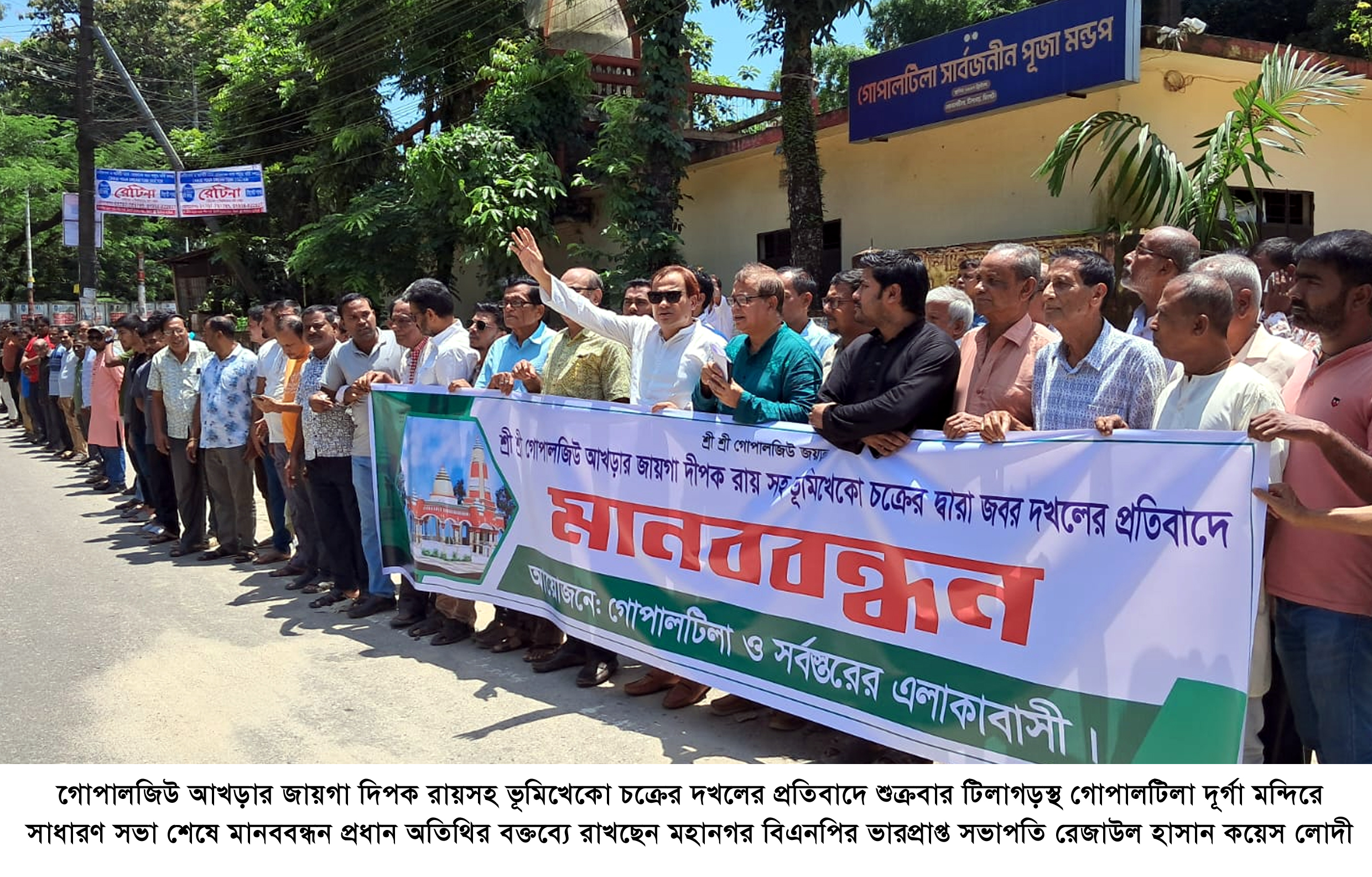 গোপালজিউ আখড়ার জায়গা দিপক রায়সহ ভূমিখেকো চক্রের দখলের প্রতিবাদে গতকাল শুক্রবার (১১ই জুলাই) সকালে টিলাগড়স্থ গোপালটিলা দূর্গা মন্দিরে সাধারণ সভা ও মানববন্ধন অনুষ্ঠিত হয়।