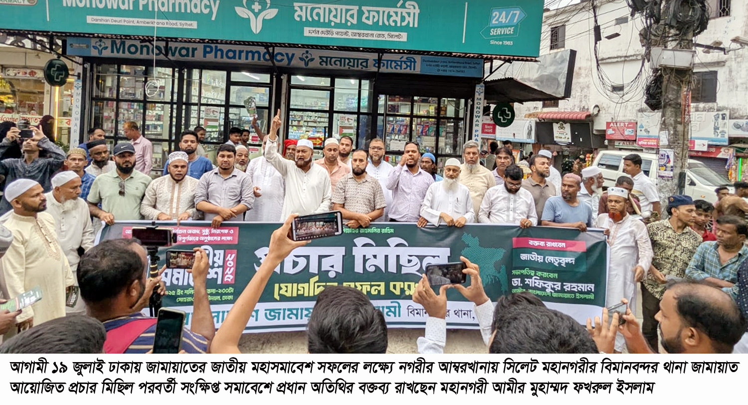 তিনি গতকাল সোমবার (১৪ই জুলাই) বিকেলে নগরীর আম্বরখানায় আগামী ১৯ জুলাই ঢাকায় জামায়াতের জাতীয় মহাসমাবেশ সফলের লক্ষ্যে সিলেট মহানগরীর বিমানবন্দর থানা জামায়াত আয়োজিত প্রচার মিছিল পরবর্তী সংক্ষিপ্ত সমাবেশে প্রধান অতিথির বক্তব্যে উপরোক্ত কথা বলেন।
