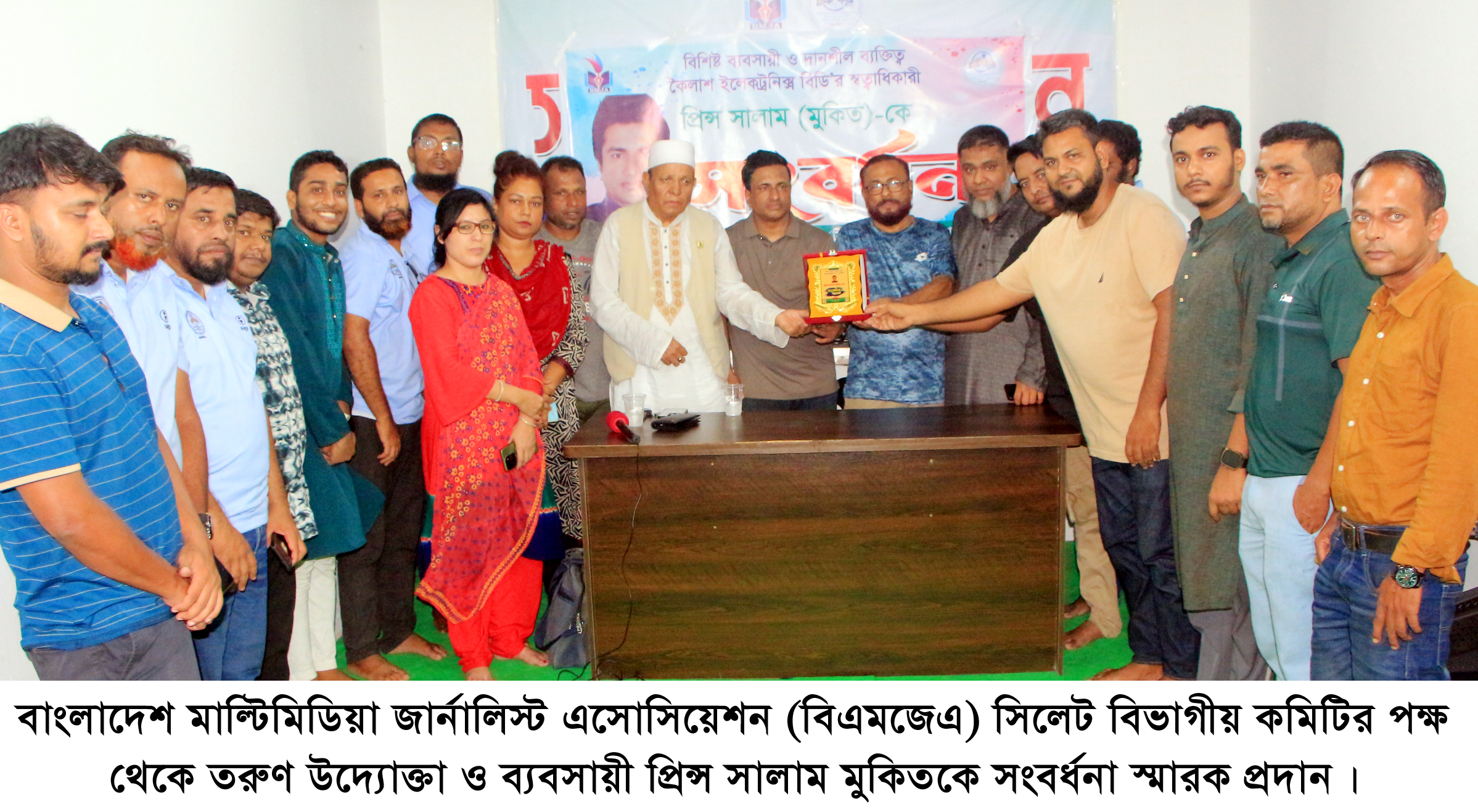 বাংলাদেশ মাল্টিমিডিয়া জার্নালিস্ট এসোসিয়েশন (বিএমজেএ) সিলেট বিভাগীয় কমিটির পক্ষ থেকে তরুণ উদ্যোক্তা ও ব্যবসায়ী প্রিন্স সালাম মুকিতকে সংবর্ধনা প্রদান। গতকাল সোমবার (১৪ই জুলাই) এসোসিয়েশনের কার্যালয়ে এই সংবর্ধনা প্রদান করা হয়।