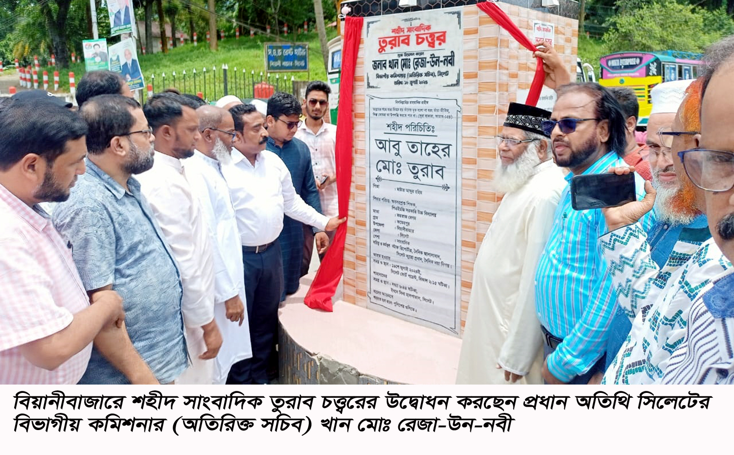 জুলাই আন্দোলনের সময় পেশাগত দায়িত্বপালনরত অবস্থায় পুলিশের গুলিতে নিহত দৈনিক জালালাবাদের স্টাফ রিপোর্টার শহীদ এটিএম তুরাব স্মরণে ‘তুরাব চত্ত্বর’ উদ্বোধন করা হয়েছে।