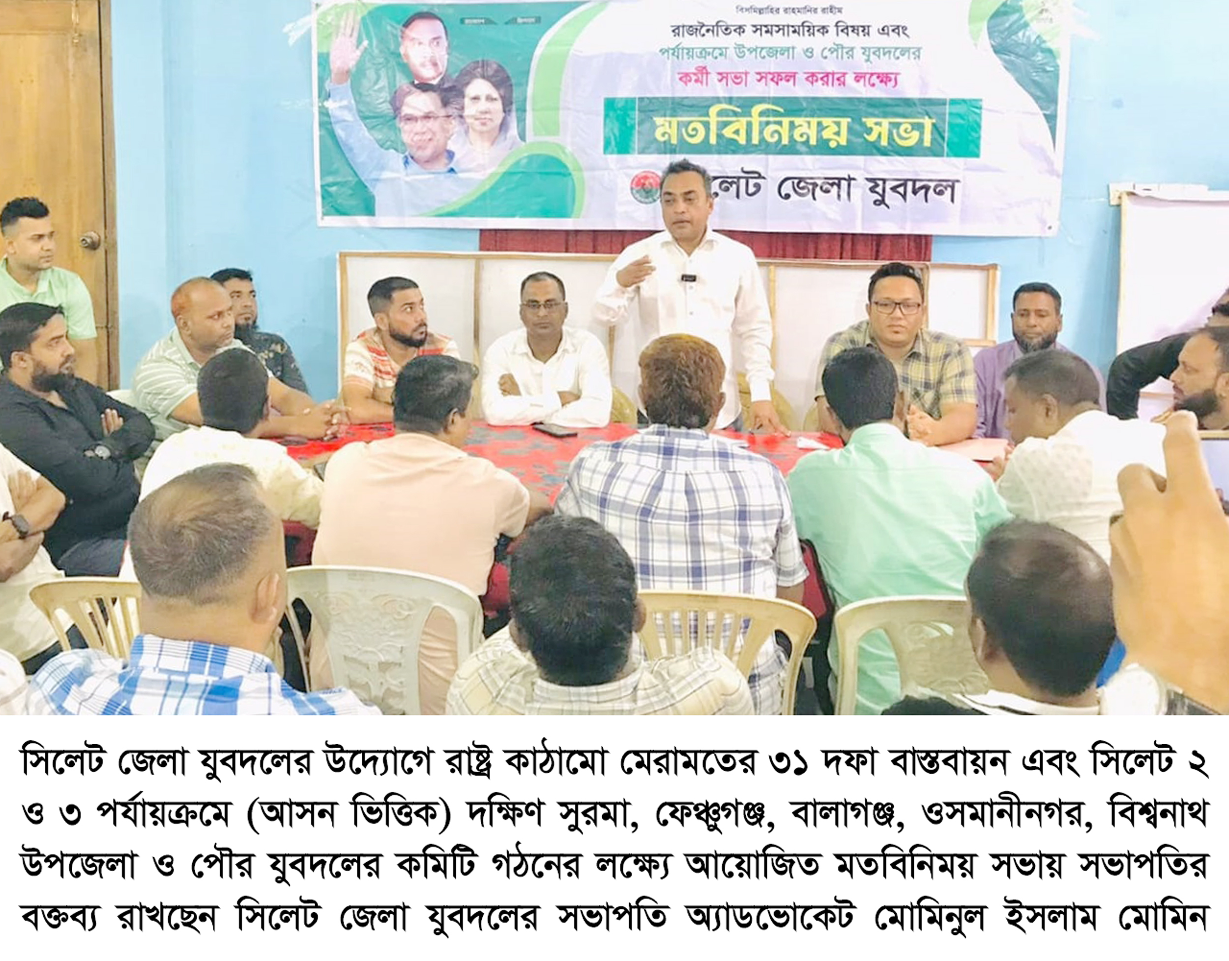 সিলেট জেলা যুবদলের সভাপতি অ্যাডভোকেট মোমিনুল ইসলাম মোমিন বলেছেন, রাষ্ট্র কাঠামো মেরামতের ৩১ দফা বাস্তবায়ন আমাদের সময়ের দাবি। যুবদল সবসময় জনগণের অধিকার আদায়ে কাজ করে যাচ্ছে।